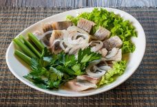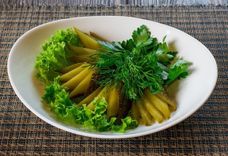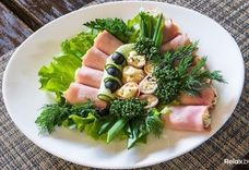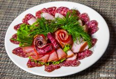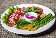 1/300 г • грудинка соленая, колбаса деревенская, полендвица, хрен, огурец соленый. зелень
