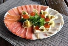 1/320 г • рыба масляная, сёмга слабосоленая, форель подкопченная, бутерброды с икрой, лимон, лист салата, оливки, зелень